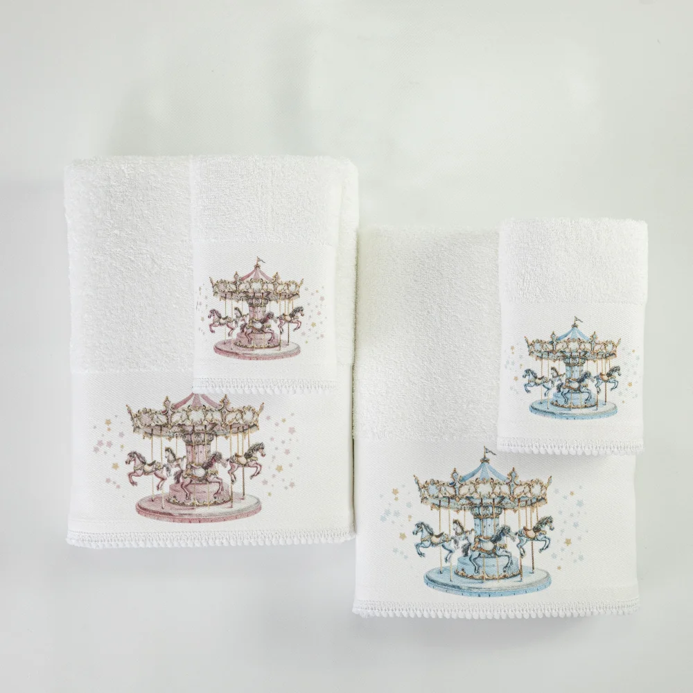 Σετ πετσέτες 2 τεμαχίων, μπάνιου και χειρός, από ύφασμα φροτέ πενιέ, 100% βαμβακερό, μονόχρωμο, λευκό, με ψηφιακή εκτύπωση σε χρώμα ροζ και δαντέλα, σχέδιο καρουζέλ.