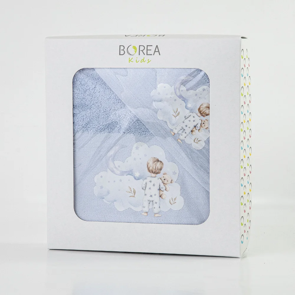 Σετ πετσέτες 2 τεμαχίων, μπάνιου και χειρός, από ύφασμα φροτέ πενιέ, 100% βαμβακερό, μονόχρωμο, σιέλ, με απλικέ, σχέδιο με παιδάκια με βρεφικές πιτζάμες. Διατίθεται σε 2 χρώματα.
