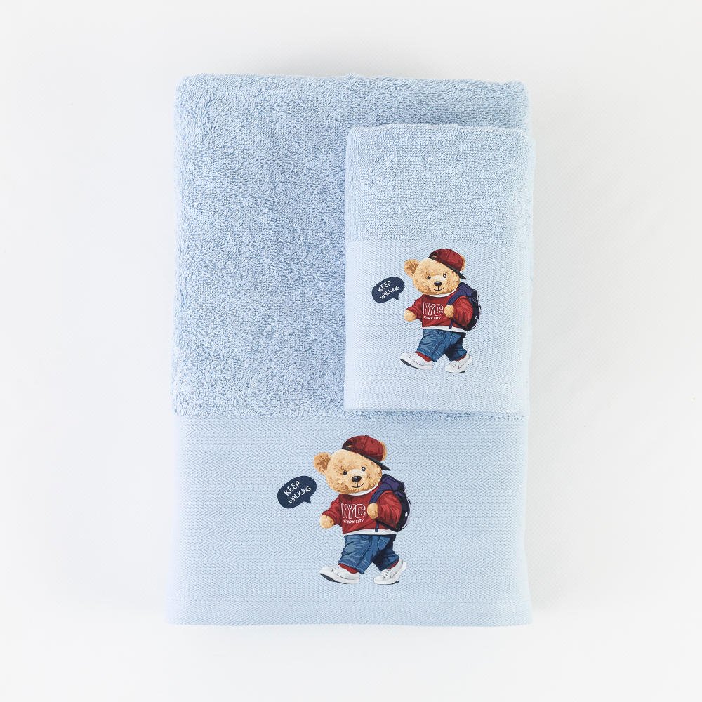 Σετ πετσέτες 2 τεμαχίων, μπάνιου και χειρός, από ύφασμα φροτέ πενιέ, 100% βαμβακερό, μονόχρωμο, σιέλ, με απλικέ, σχέδιο αρκουδάκι.