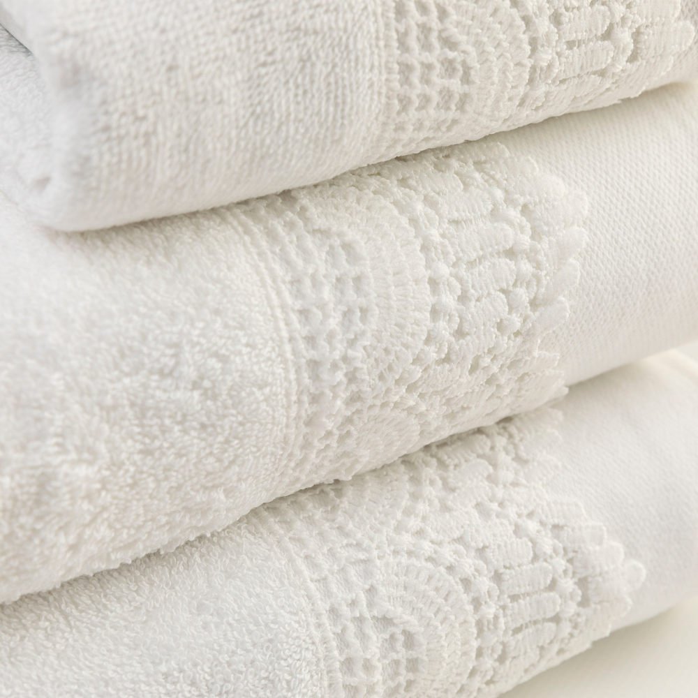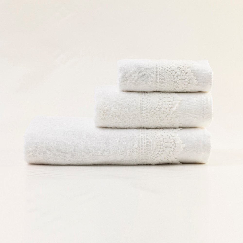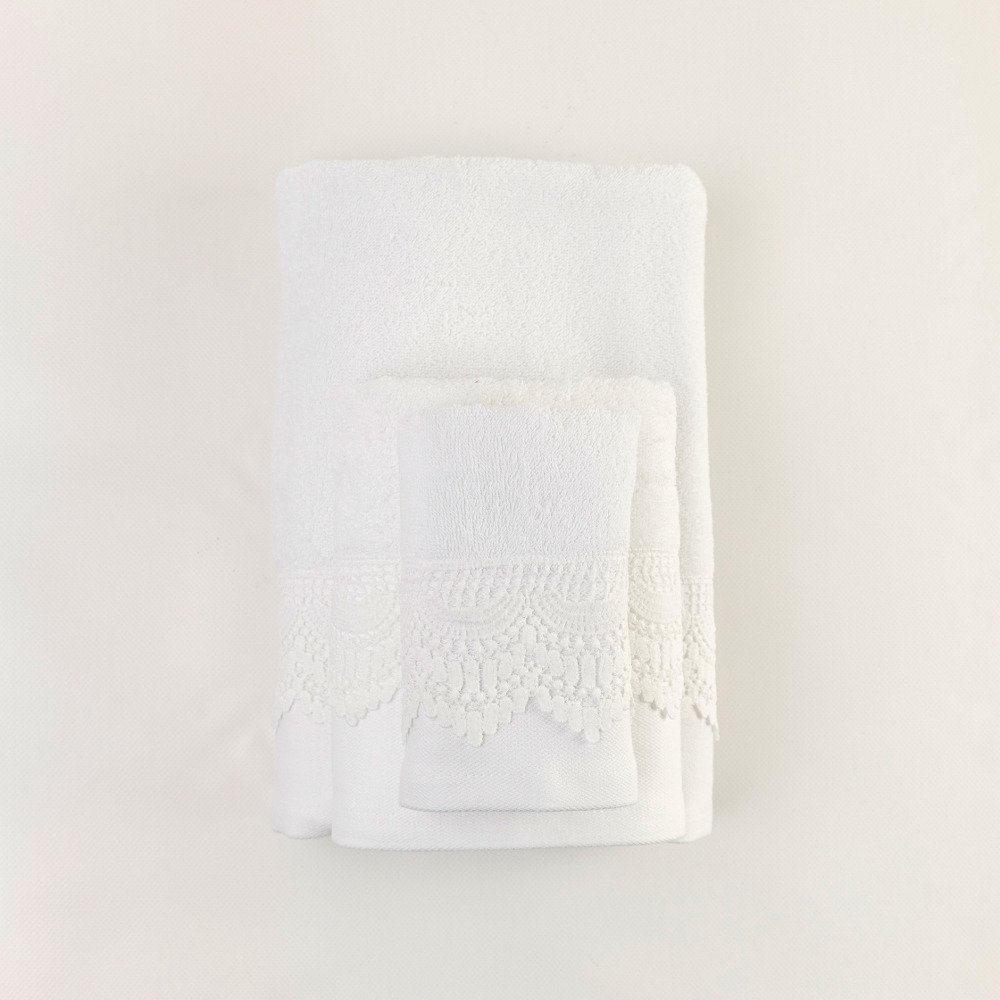 Σετ πετσέτες 3 τεμαχίων, μπάνιου, προσώπου και χειρός, από ύφασμα φροτέ, πενιέ, 100% βαμβακερό, με διακοσμητική δαντέλα. Διατίθεται σε 2 χρώματα.