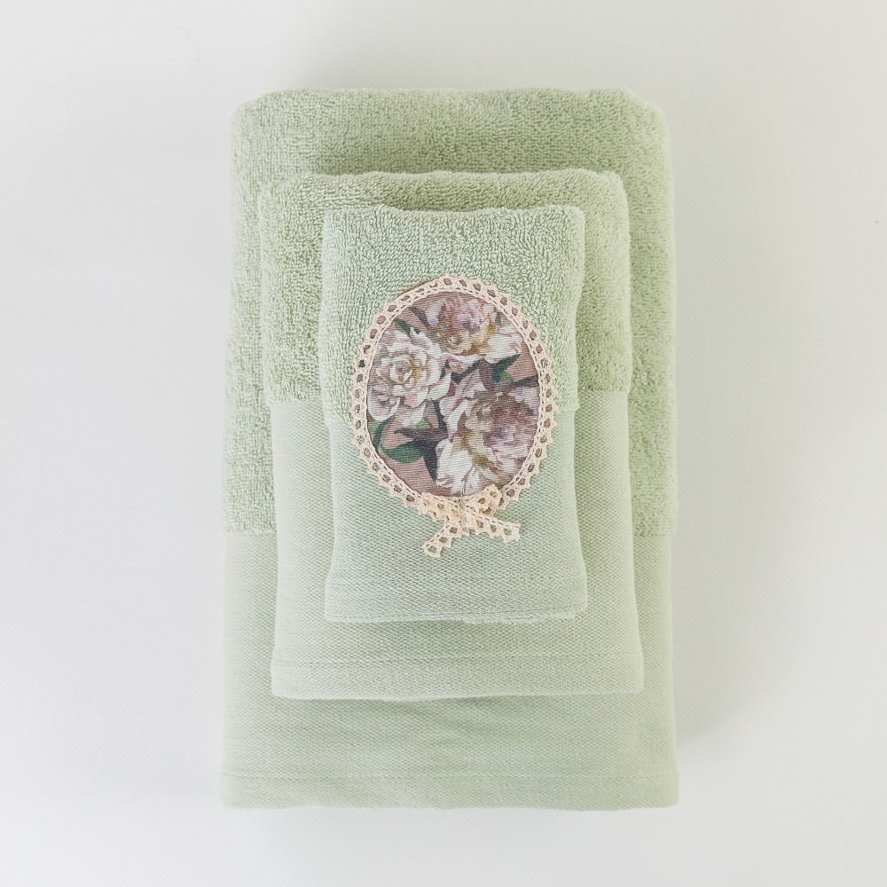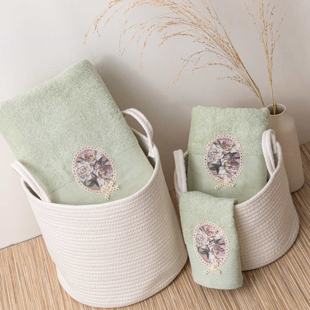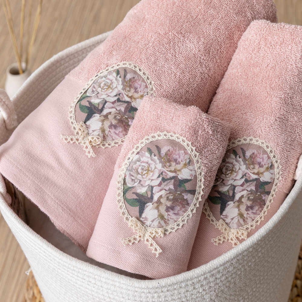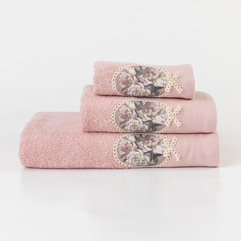 Σετ πετσέτες 3 τεμαχίων, μπάνιου, προσώπου και χειρός, από ύφασμα φροτέ, πενιέ, 100% βαμβακερό, με διακοσμητική βαμβακερή δαντέλα και απλικέ. Διατίθεται σε 3 χρώματα.