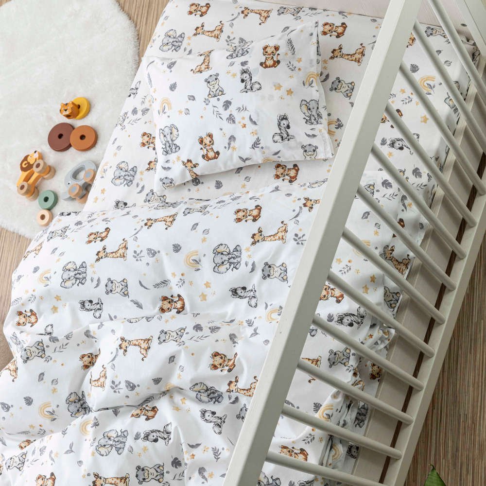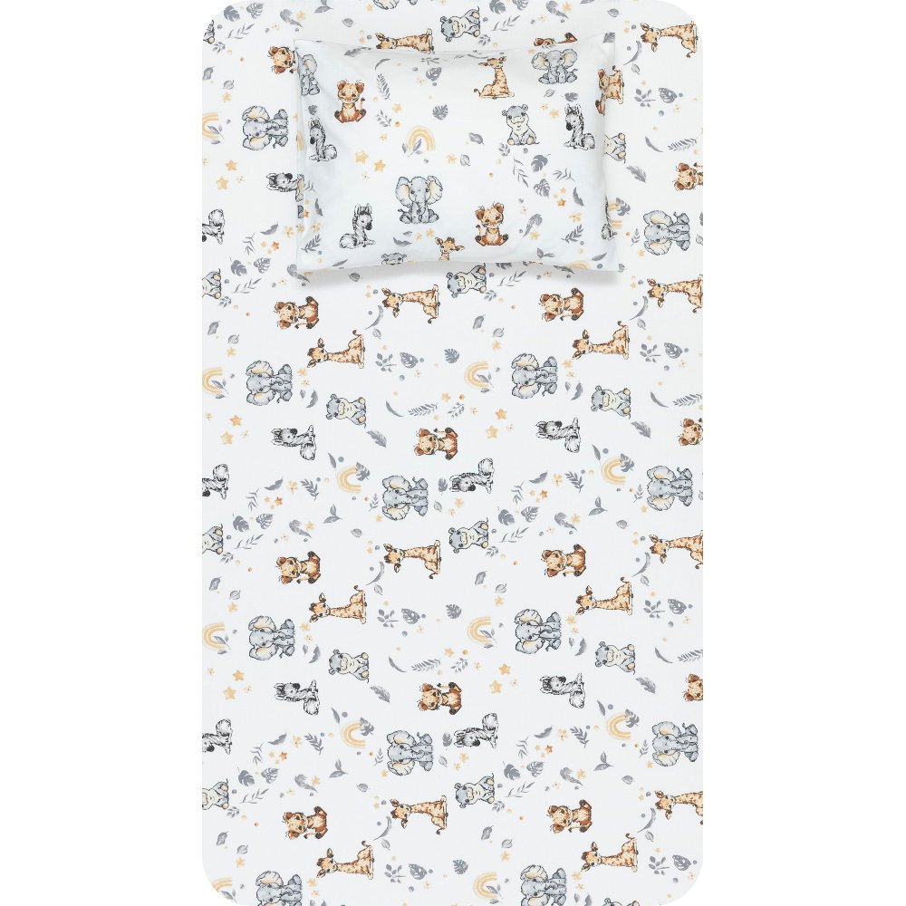 Σετ σεντόνια κούνιας με μαξιλαροθήκη από ύφασμα μερσεριζέ, 160 κλωστών, 100% βαμβακερό, εμπριμέ, σε λευκό φόντο, χρώμα γκρι, σχέδιο ζώα της ζούγκλας.